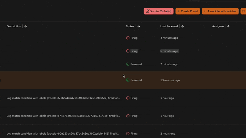 Easily select one or more alerts for bulk actions. Actions include options like “assign to incident,” “dismiss,” or other available workflows.