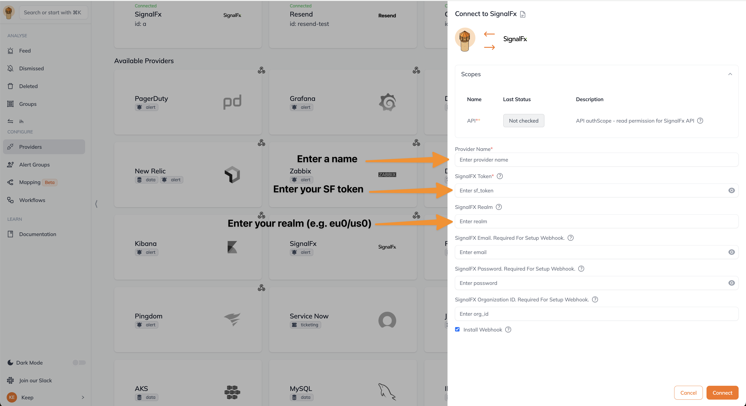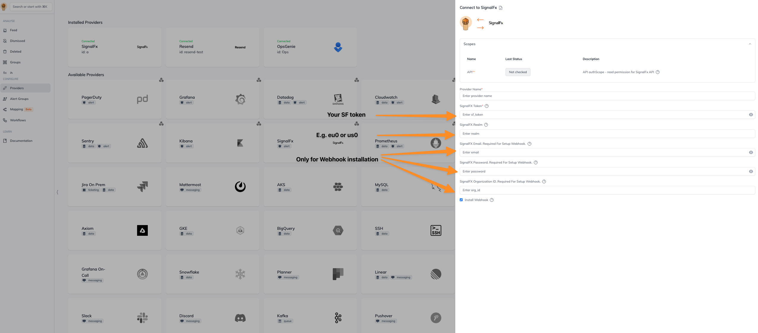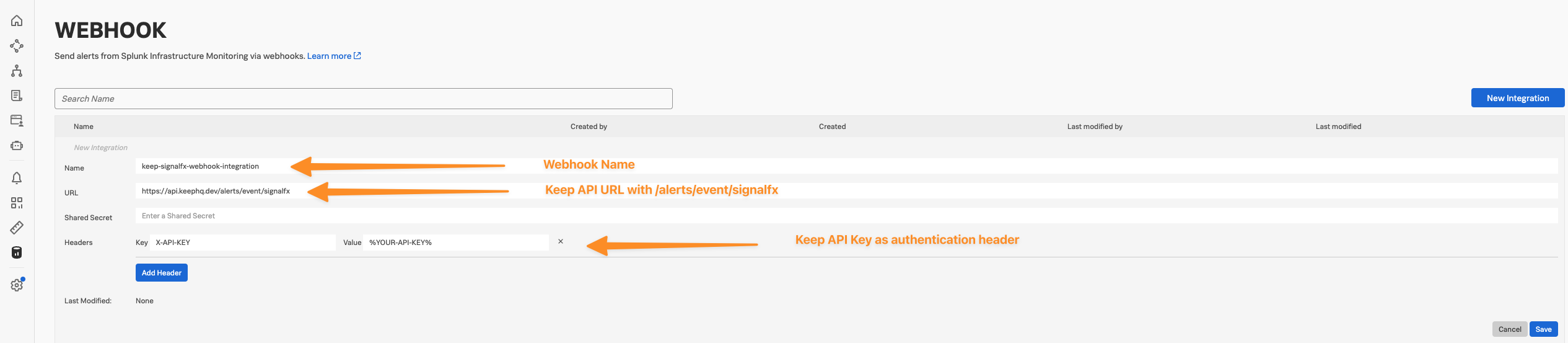 SignalFX Provider enriches your monitoring and alerting capabilities by seamlessly integrating with SignalFX Alerting via webhooks. This integration allows you to receive alerts directly from SignalFX, ensuring you’re promptly informed about significant events and metrics within your infrastructure. Key Features:- Webhook Auto-Instrumentation: Automatically configures Keep as a Webhook Integration within SignalFX, subscribing to all available SignalFX Detectors and Rules for comprehensive monitoring.