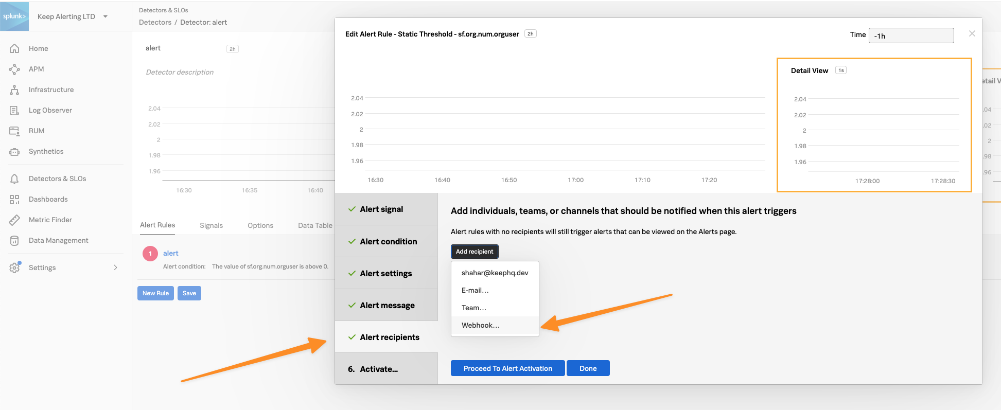 - Push (Auto Instrumentation) - Let Keep instrument itself as a webhook integration and subscribe to your SignalFx detectors.